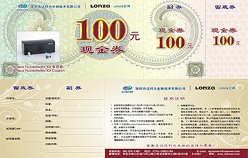 從2011年3月1日起,達(dá)科為公司Amaxa轉(zhuǎn)染試劑盒推出送禮活動(dòng),凡購買25Test轉(zhuǎn)染試劑盒均贈(zèng)送一張100元現(xiàn)金券(以此類推,多買多送), 具體使用方法見上圖現(xiàn)金券,咨詢熱線:800 830 4366 電話:0755-26410427 26650164